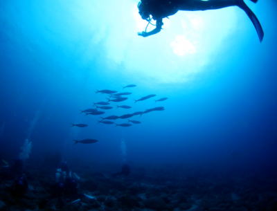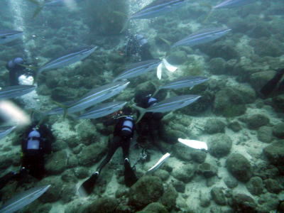 | 小さな生き物に気を取られていると・・・ 突如目の前を横切っていく回遊魚達〜\(^o^)/ ツムブリやカイワリの群れが通り過ぎていきましたぁ! |