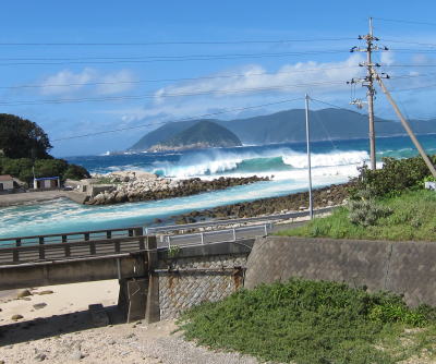 | 柏島へ渡る桟橋のところで撮影した写真はこんな感じで… ものすんごいウネリが浜に打ち付けておりました(>_<) 早く穏やかな海に戻りますように〜(^-^) |
