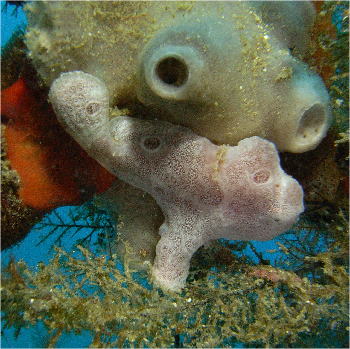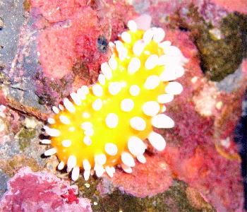 | 巨大なゴーヤほどもあるミカドウミウシにくっついていたのは これまた大きなウミウシカクレエビのペア。 |