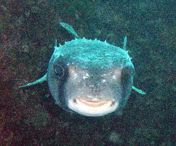 こちらもぶつかっちゃいそうになった イシガキフグ 正面顔がかわいいですね〜♪ 間違っても、口に指を突っ込んだりしたら ダメですよ〜 |