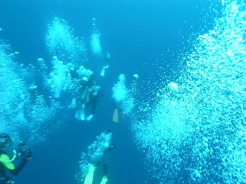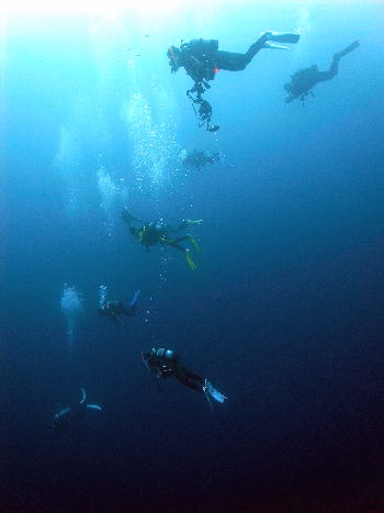 どどどっと潜行して、ガイドさんの周りへ集合です! 青い青い中層を、ずんずん進みます。 |