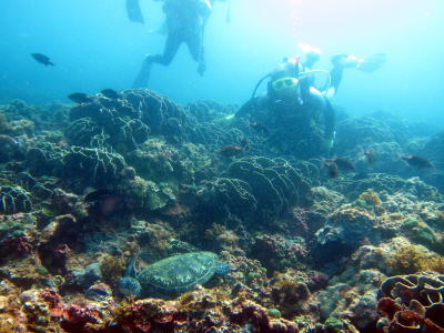 なんと運よくアオウミガメさんにも出会うことができました! 右手がちょっと不自由な常連さんでしたね(^-^) また会いたいな〜っ! |