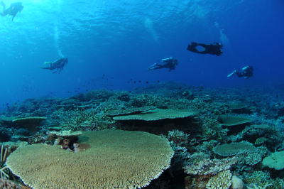 | サンゴの上を気持ち良さそうに泳ぐダイバー達 絵になりますね〜♪ |