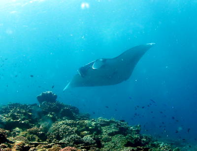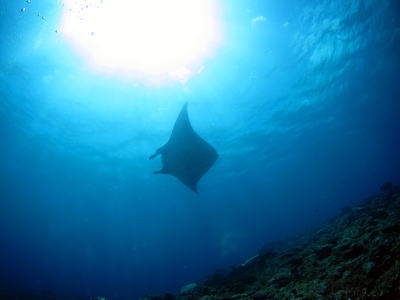 | そして、お待ち兼ねの「マンタ様」との出会いです! ドキドキ☆ワクワクしながら 根につかまってじーっと待っていると・・・ やってきました、マンタ様です〜ぅ\(^o^)/ |
