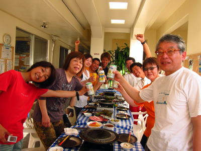 | そして、なんとこの日の特別ゲスト登場〜♪ 金城のおじいが、三線を片手に現れてくれました! 沖縄民謡と楽しいおじいの会話を楽しんで、 楽しい楽しい最後の夜になりました! おじい、有難うございました(^○^) |