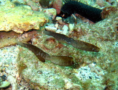 | なんとなんと、カミソリウオのペアをはっけーんo(^-^)o 思わず水中で興奮してしまいましたぁ! 講習生のSくんは お魚だったんですか〜?と あまりの不思議生物に驚いていました! |