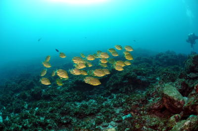 | やっぱりこの季節の海は 透明度がいいっ!!! カゴカキダイの群れが 青い海に映えています〜(^○^) |