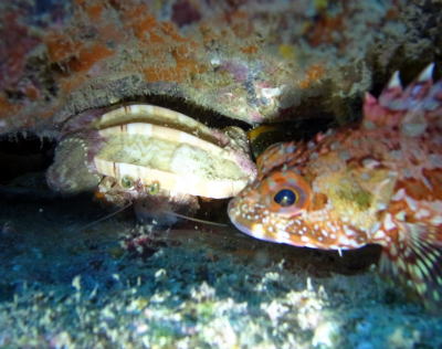| そして、ソメンヤドカリと カサゴの見つめあい(*^。^*) それとも、ニラミあいなのか〜っ?? |