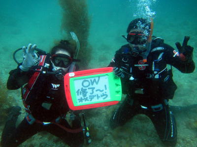 | 水曜&木曜の平日で、白崎へOW講習に行ってきました!初日はプールで練習してから、初めての海へ!ドキドキでしたが、お魚いっぱいでしたね(^-^) 木曜は、前日のおさらいをしながら、海の中を泳いで、お魚や景色を楽しみながら、中性浮力の練習〜♪最後はいい感じで泳げるようになってきましたね!Yさん、Kさん、講習お疲れ様でした!そして、ダイバー認定おめでとうございます(*^。^*) これからも宜しくお願いします!! ![]() |