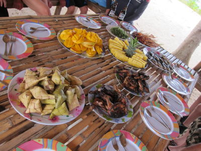 クルーが潜っている間に焼いてくれていたチキンやポーク串 もちろん南国フルーツ マンゴー&パインも美味でした(^○^) |