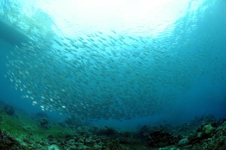 | 最終日はコンティキのハウスリーフでメアジの大群狙いです! ドロップオフの壁沿いにもびっくりするくらいのメアジ!! 最後の棚の上ではいい感じにアジ玉もできてました(^○^) |