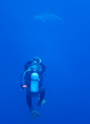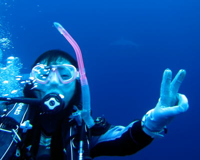 | そして、3本目は与那国ヘビーリピーターのSちゃん 400本記念ダイブです\(^o^)/ さぁ、ハンマーもお祝いに来てくれるかな〜? |