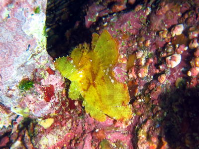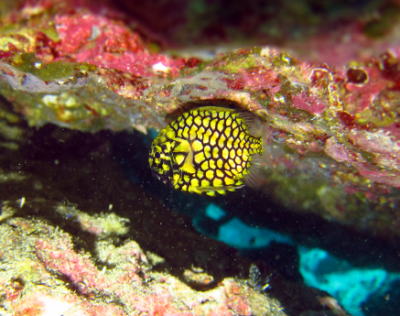 | Kさん発見のマツカサウオ♪ ゴールデンイールモレイは見れなかったですが、 代わりにゴールデンなお魚登場でした! |