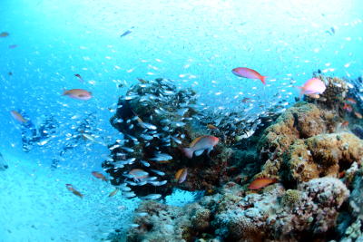 | 今年の青さはこれまでの座間味ツアーの中でも まさにTOPクラス(o^o^o) その青い海に、サンゴとグルクンが映えますね〜! |