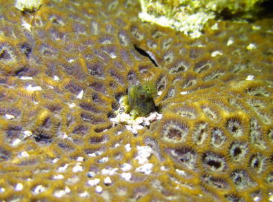 | ナイトダイビングでも元気な姿を見せてくれたコケギンポのセンター長! 途中全身でてきて晩御飯をパクっと食べていましたよ! |