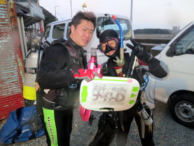 奥様の300本記念には バディとしてご参加いただきました(^○^) これからもご夫婦で仲良く潜りに来てくださいね〜♪ 後には、今だけのクリスマスツリーも写っておりますよ! |