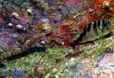 | そして、Tちゃんが何気に撮影していたこの右側の子 左のイシヨウジの頭と比べても 随分小さいのがわかると思います。 調べてみたら、タカノハダイの超ちびっ子のようでした! |