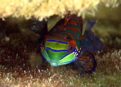 いつもは穴の中に入っているセグメンテッドブレニーさん どうやらこの体色は婚姻色らしく アピールで全身でてたのかもしれないですね(^○^) |