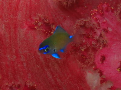 | 水温もあがってきて可愛い赤ちゃんが増えてきました! こちらは蛍光ブルーのラインがきれいな アマミスズメダイの赤ちゃんです(^-^) 背景のソフトコーラルもきれいですね♪ |