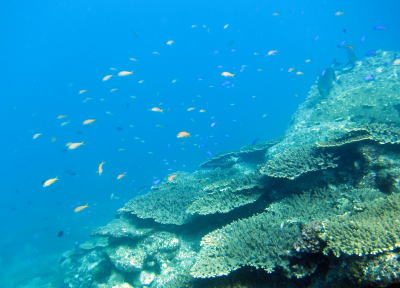 浅場のサンゴはどんどん復活〜\(^O^)/ キンギョハナダイやソラスズメダイが乱舞していて とってもキレイな景色を楽しめますよ! |