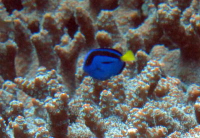 | サンゴの隙間には先日から登場している ナンヨウハギのお子様が出たり入ったり〜♪ 少し離れた場所から見ていると ばんばん外を泳ぎ回っているのも確認できますよ(*^_^*) |