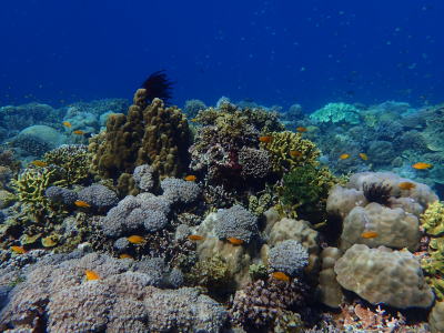 ハードコーラルやソフトコーラルが 入り乱れるように群生して スズメダイやハナダイの群れがいっぱいなんです(^-^) |