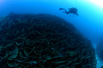 この日ラストのウーロンチャネル! 上げ潮を狙ってのエントリーです(^○^) チャネルの入り口付近で一瞬マダラトビエイがはばたき〜 その場で待っていると、 なんと頭上にまさかのマンタが登場! これには一同驚き&大興奮でした(´∀`) |