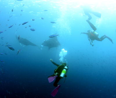 | この日の4本目 ジャーマンチャネルでは、クリーニングステーションにマンタは現れず… 最後は沖出しでマンタを探します! すると… 来ました!!!!!マンタ登場です〜♪最初は2枚!! ![]() 次にやってきた時にはなんと3枚になり〜 ![]() 最終的にはなんと4枚〜〜〜〜〜\(^O^)/\(^O^)/\(^O^)/ もう興奮が止まりませんっ!! ![]() こーんな大接近で巨大なマンタの乱舞と遭遇しちゃうなんて、 なんというラッキーなんでしょう(*^_^*) ![]() 安全停止を終えて浮上後にふと水中を見るとそこにもマンタがっ! 思わずもう一回潜降してしまいました(´∀`) ![]() これほど「あがりたくないっ!!!」と思ったことはないくらいあがりたくなかった〜(≧▼≦) |