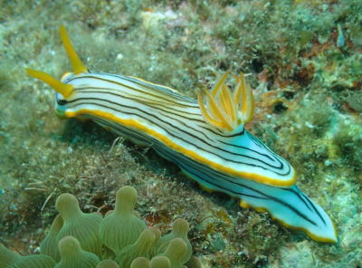 | スリムなクロスジウミウシさん! どちらかというと温帯に適したウミウシさんなのかな? |