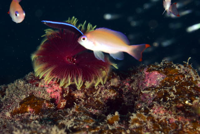 ![]() 大人気のキレイなケヤリムシと可愛いコケギンポの赤ちゃん♪ そこへケラマハナダイさんにホンソメワケベラのお子様も乱入?! |