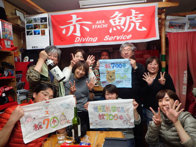 ![]() 毎年恒例1月の3連休は串本で新年会でーす! そして、この週末はお祝いがいっぱいでした(^-^) Rさん&Sさんの700本記念♪お二人とも、おめでとうございます! Pちゃんの旗もそろうとトリプル700本〜っ!!全員合わせたらえらいことになりそうです(笑) 皆様、今年も安全に楽しく潜りにいきましょう♪ |