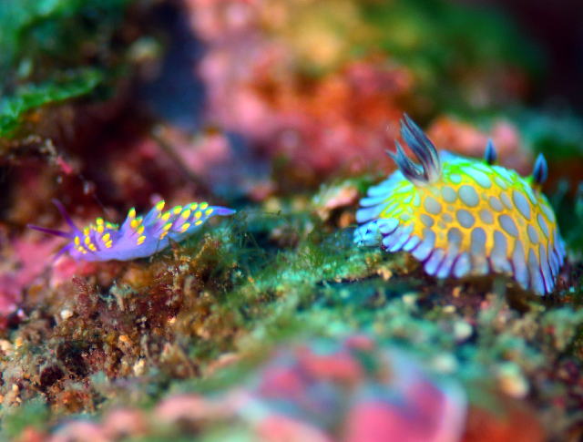 | なぜかここのところ毎週毎週、週末になると冬型やら寒気が降りてきたりやら… では、ありますが、この週末もばっちり潜れちゃいましたよ~(^-^) さすがの冷え込みに海も連動して、水温が少し下がってしまいましたが、 その分ウミウシ達は続々と登場しておりますし、 お魚さんは動きがゆっくりになって、写真を撮り易くなってるかも?! まずはウミウシパラダイス~な吉右衛門です! いつものシンデレラちゃんにカグヤヒメちゃん達常連メンバーはもちろんですが こんなコラボレーションとか ![]() ちょっと珍しい貝も登場しましたよ~(´∀`) 当店ではもちろん初登場の その名も「クチムラサキウミウサギ」 黒地に白い点々のウミウサギちゃんしか知らなかったけど、他にもお仲間がいたんですね~!! しばらくいてくれるでしょうか~? ![]() サンビラでは、残念ながら先週ゲットしたあの子は姿を消してしまいましたぁ(ToT) ただ寒いから出てきてないだけだと信じたい… 砂地のハゼさん達や、サンゴの隙間を泳ぐチョウチョウウオ系の赤ちゃんはまだ元気にしてましたよ~! ![]() この日のラストは、久しぶりのビーチへ! すると、この季節ならではのフクロノリパラダイスが始まっていました~! そんなフクロノリをじっくり見ていると、ウミウシのお仲間や、お魚さんもカクレンボしてるんですよね~! ![]() さて、前日よりもさらに穏やかになってきたかな? まずは前日にお会いしたあの貝をチェーック! 次はいつどこで出会えるかわかりませんからね~っ(^-^) それにしても、本当にどんどんウミウシ増えてます! ミチヨミノウミウシとボブサンウミウシのコラボだって見れちゃいます(^-^) ![]() 2本目の住埼では、もう夏から居ついているであろうホホスジタルミのお子様がまだいるんです! 水温はさがっても、クダゴンベちゃんやハナゴンベちゃんなど南の海のお魚さん達も頑張ってますので、 皆さんもこの寒さに負けないで、会いに来てあげてくださいね~っ(^_-)-☆ ![]() ラストは備前で、ここのところ増えてきたミカドウミウシに今日はカクレエビついてた~! でも、泳ぐ~っ!! なかなか活発なこの子たちをじっとさせる技をあみだしたいものです。 ![]() ということで、2月らしい海、満喫の週末でしたね! ご参加いただきました皆様、有難うございました~\(^O^)/ ![]() |