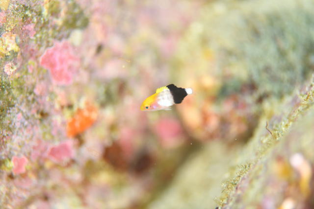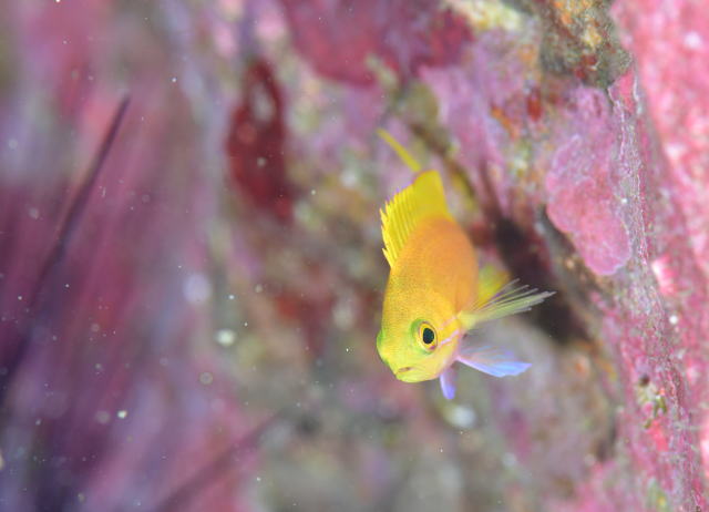 スミレナガハナダイの♀は警戒しているのか岩にぴったり張り付いてます。 この子のカラーリングも鮮やかでいいですよね〜 |