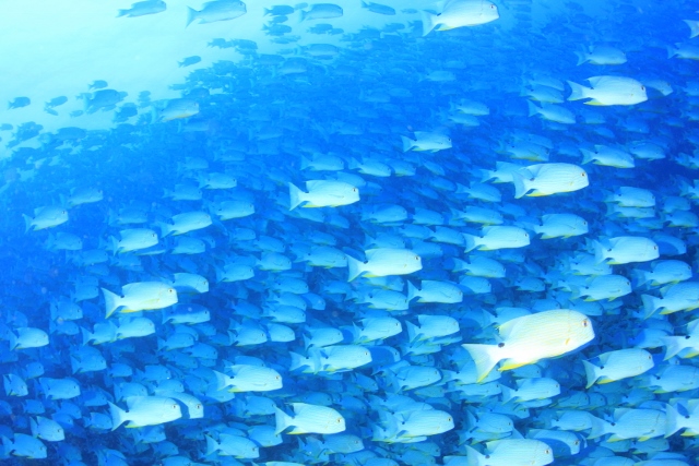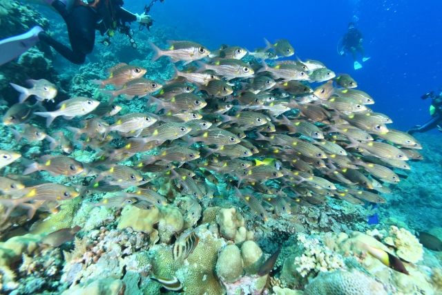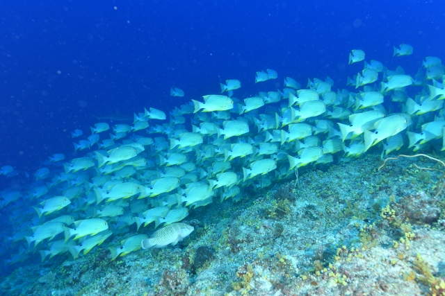 ![]() ペリリューのイレズミフエダイの群れ〜(^-^) 群れの厚さがよくわかる一枚です! 耳の調子悪いとは思えない潜りっぷりでしたよ(^_-)-☆ |
