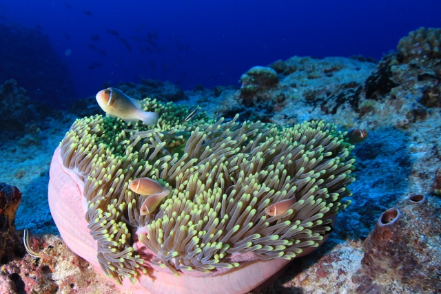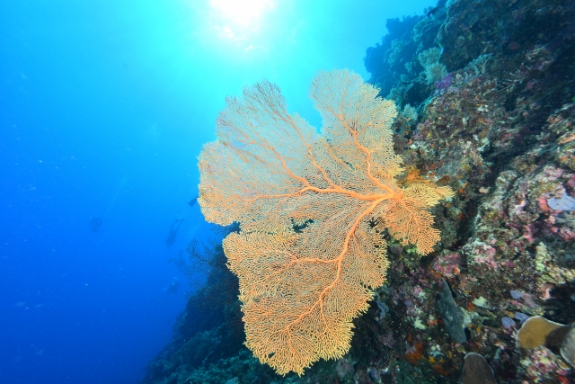 ![]() ついつい吸い込まれてしまうドロップオフのはえもの〜(^_-)-☆ はえもの越しの青い海とダイバーがいい感じです♪ |