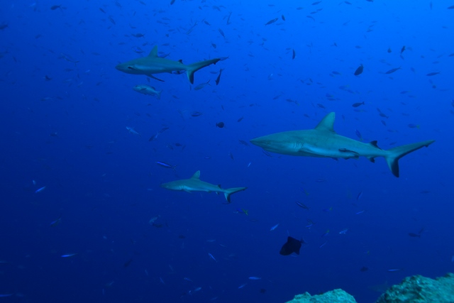 ![]() こちらはブルーコーナーのグレイリーフシャーク達\(^O^)/ よ〜く見ると、体に傷跡があり、おそらく繁殖の際にオスに噛まれた跡なんだろうな。 |