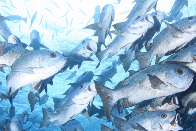 ![]() のんびり潜ったゲメリスウォールでは、ノコギリダイの群れ〜(^-^) 皆仲良く同じ方向を向いて泳いでいます! |