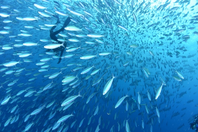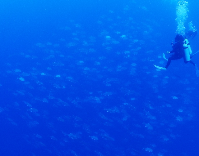 ![]() ペリリューの後は、ブルーコーナーへ! いい感じの上げ潮でフッキングして、ギンガメアジの群れを激写! |