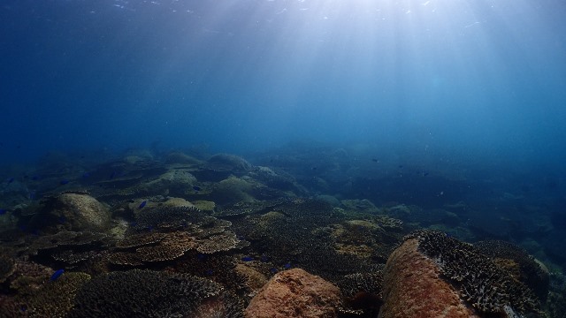 ![]() 浅場のソラスズメダイの群れとテーブルサンゴの群生〜♪ 光も射しこんでキラキラ☆彡キレイでした〜\(^O^)/ |