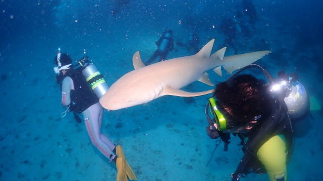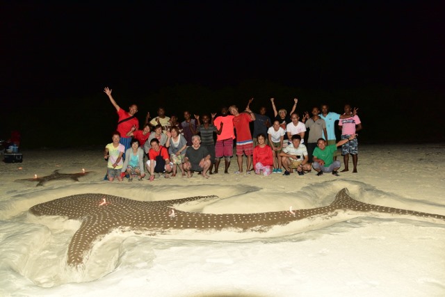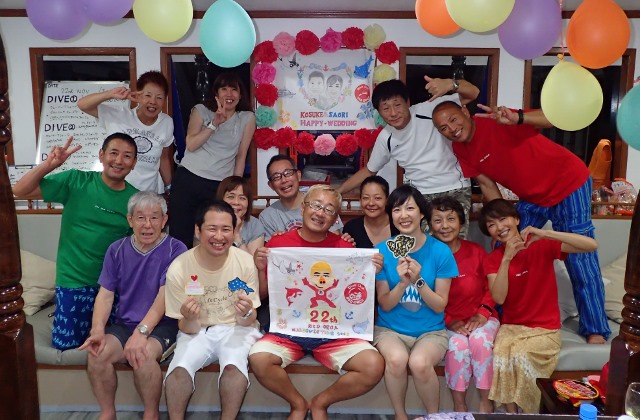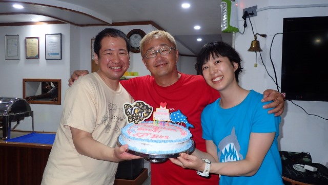 | 二年ぶりのモルディブクルーズツアーへ行ってきました~! 今回もソレイユ号を貸し切って、前回参加のリピーターさんが4名、初モルディブの方、新婚旅行でご参加くださった方など わいわい総勢14名で楽しい7泊8日のツアー♪ 天候や海況、そして海での出会いにも恵まれたた最高のダイビングクルーズになりました\(^-^)/ 出発日は朝8時30分頃、関空に集合して、まずはシンガポールへ! ![]() 今回、新婚旅行でご参加のお二人のチケットには、なんとこんな文字が! ![]() 機内でも、ケーキとシャンパンがふるまわれたそうですよ! シンガポール空港に到着したら、フードコートでご飯を食べておしゃべりしたら、トランジットの時間です。 長い移動時間も、映画を見たり、寝たりしていると意外とあっという間にモルディブ マーレ空港に到着! 空港には、ソレイユ号のスタッフがお迎えに来てくれて、すぐにドーニへ乗り込んで、今回の旅のクルーズ船ソレイユ号へ! 昨年から内装などやりかえられたソレイユ号の船内はとてもきれいで、快適なお部屋です(^O^) 到着日は時間も遅いので、ブリーフィングを聞いたらお休みなさい(´ω` )zzZ 翌朝は、早めに起きて、早速一本目へ~! まずは北マーレの、ヨスジフエダイが群れているポイントへ! ![]() 移動途中には、マッコーズフラッシャーや、砂地にはガーデンイールもいっぱいです(*゚∀゚*) そして、ヨスジフエダイが山のように群れている根でのんびりと遊びました! 二本目は、北アリ環礁まで移動して、シャークダイブ!少し透明度は悪かったですが、 巨大なナポレオンや、グレイリーフシャークやホワイトチップなどのサメをウォッチング(^-^) ![]() そして、夜にはナイトマンタダイビング~♪日がくれ始めると早い時間から船の後ろにマンタがやって来てくれました! ![]() 船の上からでも水面近くでマンタが捕食のためにグルグルとまわってくれて、それだけでも大興奮!! 早速準備していざナイトマンタダイビングへ~♪ 皆で半円を描いて着底して待っていると、目の前までマンタがやって来てくれました~\(^-^)/ ![]() 何度もぶつかられたゲストさんもいらっしゃいましたよ! 大迫力のナイトマンタをたっぷり堪能しました(^○^) ナイトマンタのあとは、美味しいディナータイム♪ 前回とコックさんが変わっていて、以前よりも美味しくなった食事に、ゲストの皆さんも大満足で食が進みましたね! 翌朝は、まずは前回潜って、魚の多さに感動したフィッシュヘッドへ! 少し透明度は悪かったですが、グレイリーフシャークやホワイトチップなどのサメに、ベンガルスナッパーやヨスジフエダイの群れなど、群れ群れの海を満喫しました! ![]() そのあとは移動して、この日はマンタ狙いの1日! 南アリ環礁のポイントでマンタを狙いました! クリーニングステーションには、マンタさんがまだ来ておらず、代わりにヨスジフエダイやムスジコショウダイ、ヒメフエダイが群れていたり、タイマイがいあり、マダラトビエイが泳いできたり、と、マンタさんがいなくても、十分楽しめる海でした!が、なんと安全停止を始めようかと言う頃に、クリーニングステーションに向かって、大きな大きなナンヨウマンタさんがやって来てくれました~\(^-^)/ ![]() 欲を言えば、もうちょっと早めに来てほしかったですが、出会えただけで嬉しいですね♪ もう一本、移動してのマンタ狙い!リーフのへりを泳ぎながらマンタを探していると…大きなマンタさんが後方からゆっくりやってきてクリーニングステーションの方向へゆっくりと泳いで行きました!その後は、どこかへ行ってしまいましたが、ひとまず出会えたのでよしとして、お魚の多い水中を楽しみました! 3ダイブしたら、この日の夕食は、無人島でのディナー♪ ディナーを待つ間も、きれいな夕日&夕焼けに皆さんゆっくりする暇もなく船の屋上で夕日の撮影大会~♪ 偶然通りかかったドローンからの空撮映像に撮っていただけるというラッキーな出来事も! ![]() 準備が整い、順番にディンギーで無人島へ上陸~♪ 船のクルーが総出で作ってくれた砂のジンベイザメは、そのクオリティがヤバイ! 今回、私だけ作成現場に立ち会わせてもらったのですが、他の船のジンベイザメと比べても、 本当に出来が良くて、とっても素敵な砂ジンベイザメをテーブルに美味しいディナータイムとなりました(^-^) ![]() 夢のような時間が続いていきます♪ さぁ、ダイビング3日目はジンベイ狙いの日です! 早朝ダイブは、サメ狙いのポイント ブラーティラへ! ここにはなんとハートに見える穴があいています! ![]() 新婚旅行のお二人にぴったりでしたね~(^_-)-☆ そして、さらに南へ移動しての、ジンベイ探しに入ります!! 現れたらすぐにエントリーできるように3点セットを準備してドーニに乗り込み探しますが、 ここ最近ジンベイ遭遇率が低いそうで、なかなか現れてくれません(>_<) こうなったら、ダイビングで探そう、ということで、ディグラコーナーへエントリー! ドロップ沿い