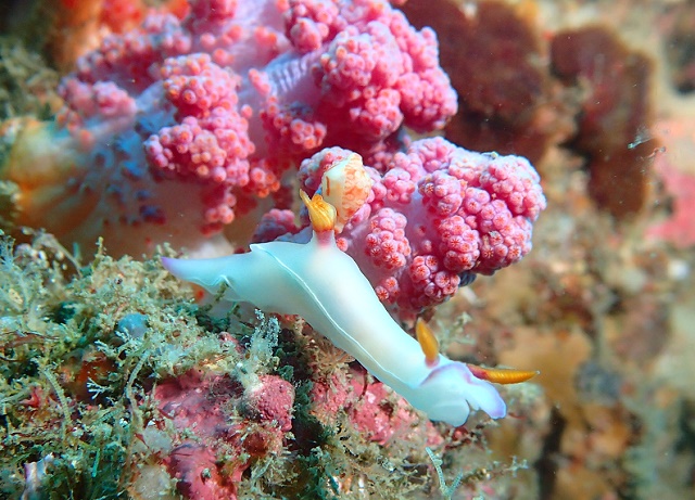 お花畑をお散歩中のゾウゲイロウミウシ!ソフトコーラルには、可愛い貝も乗っかってます! |