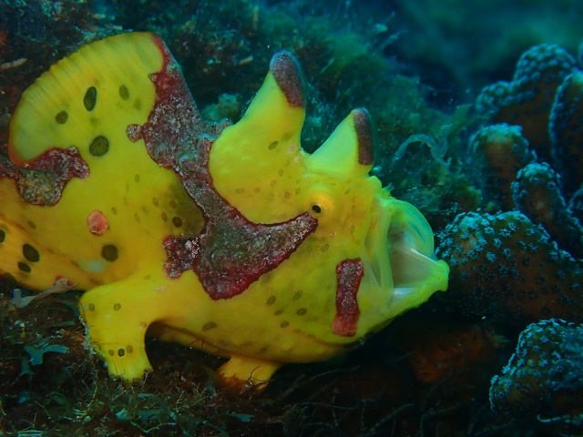 ![]() こちらもハッピーカラーの黄色いクマドリカエルアンコウさん! なんと偶然にも大あくびの瞬間をゲット〜っ\(^-^)/ |