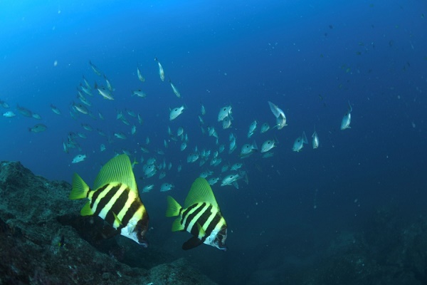![]() クロホシフエダイの群れはどんどん増殖中! それを横目にのんびりと泳ぐテングダイさんです(^-^) |