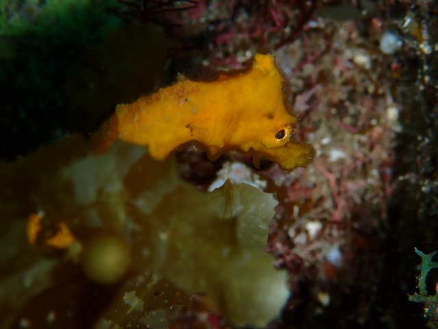![]() 海藻の隙間から「見つかっちゃった…」と声が聞こえてきそうな カメラ目線のオオウミウマのお子様です! |