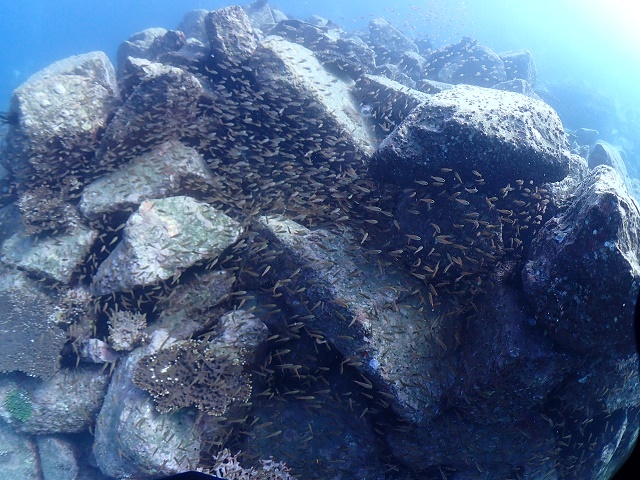 ![]() クロホシイシモチも大量発生! 周りにはアオヤガラやハナミノカサゴが襲撃の時を待っていましたよ! |