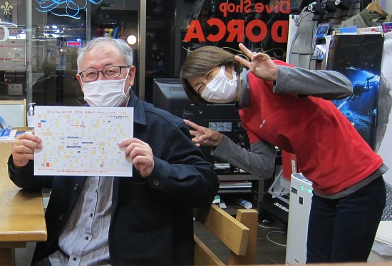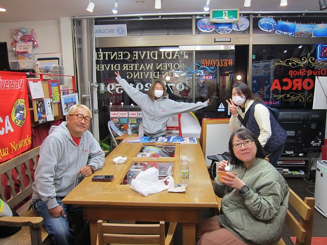 | 2021年12月27日(月) デビューです!! これまでめちゃくちゃいっぱい電車で串本にお越しくださったSちゃん いよいよマイカーデビューされました~\(^-^)/ ![]() 今日は思い切って実家まで車で帰った後に、 さらにレッドオルカまで初ドライブ~♪ よくぞたどり着いてくれました(笑) ![]() これで来年は、車でスイスイ串本に行ける日も近い?! くれぐれも安全運転で、マイカーライフ楽しんでね(^_-)-☆ さて、明日、28日は定休日、 その後年末年始は串本で滞在予定のため、 お店の営業は今日が最後になってしまいました~(>_<) あっという間だった2021年 コロナ禍にも関わらず、ご愛顧いただきました皆様 誠に有難うございました! そして、コロナ禍で潜りに来れなかった皆様も、 来年こそは安心して、色々な場所へも行ける、 ダイビングも安心して行ける、そんな年になっていきますように♪ よいお年をお迎えくださいね! 新型コロナウイルス感染症対策について 皆様に少しでも安心してご利用いただけるよう、感染防止対策を徹底いたします。 当店のご利用に際して、お客様にも感染防止のご協力をお願いすることもございますが、 何卒ご理解とご協力をお願いいたします。 【当店の感染防止対策に関する取り組み 必ずご参加前にご覧ください。】 【ダイバーにできる8つの感染対策については、こちらをご覧ください。】 ※現地 赤鯱ダイビングサービスをご利用の際、感染拡大防止のため、 これまでご利用いただいておりましたレンタルタオル・サンダルのご利用をお控えいただいております。 ご迷惑をおかけしますが、タオル・サンダルなど各自お持ちいただくようお願いいたします。 なお、感染状況が悪化し、再び緊急事態宣言が発令された場合など、状況を見て再び営業を休止する場合がございます。その際は、改めてお知らせいたします。 何卒、宜しくお願いいたします。 |